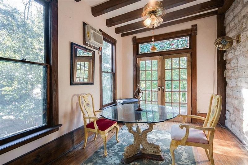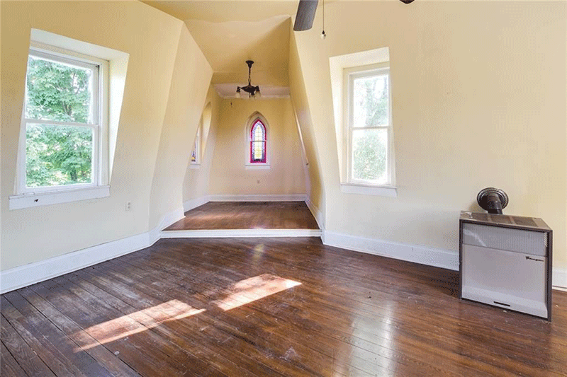 He first built four back rooms as a simple cottage, then “as the Lord provided”, he was able to add the impressive three-story front part of the house, along with the Tiffany-style stained glass windows designed to show his call from God to the ministry.